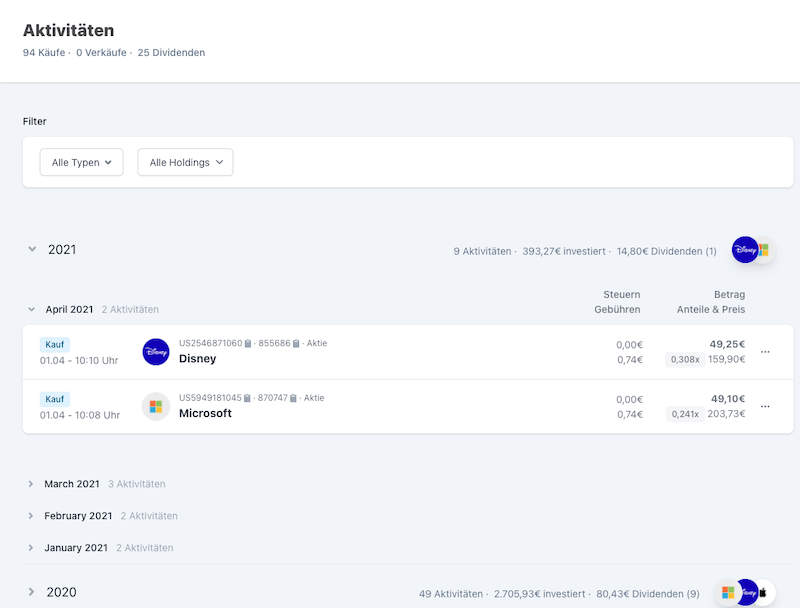Eine der größten Neuerungen ist die Aufspaltung deiner Aktivitäten nach Jahren und Monaten. So siehst du leichter, in welchem Zeitraum du wie viele Aktivitäten du zu Parqet hinzugefügt hast. Wenn du besonders viele Aktivitäten in Parqet eingetragen hast, werden diese zusammengeklappt dargestellt, um die Übersichtlichkeit zu wahren.